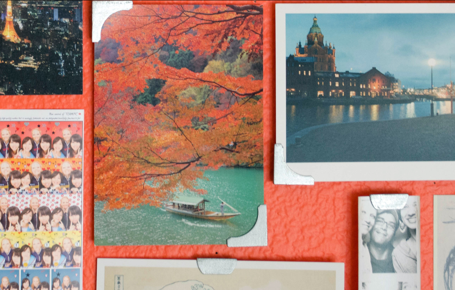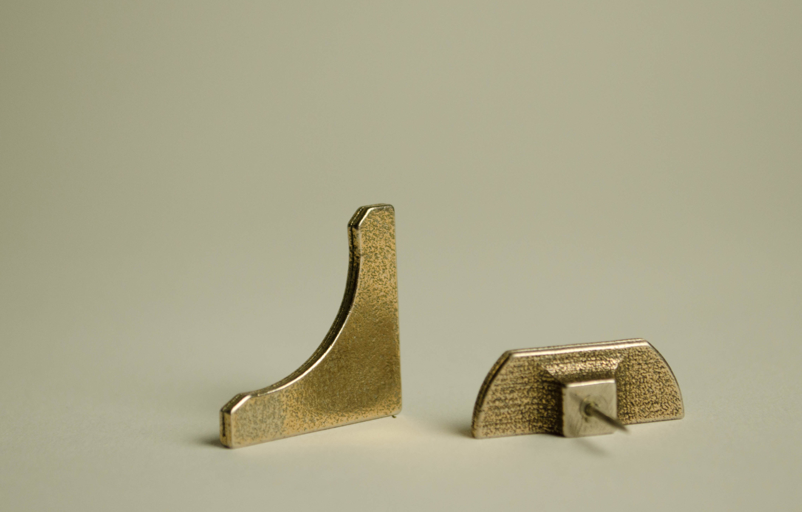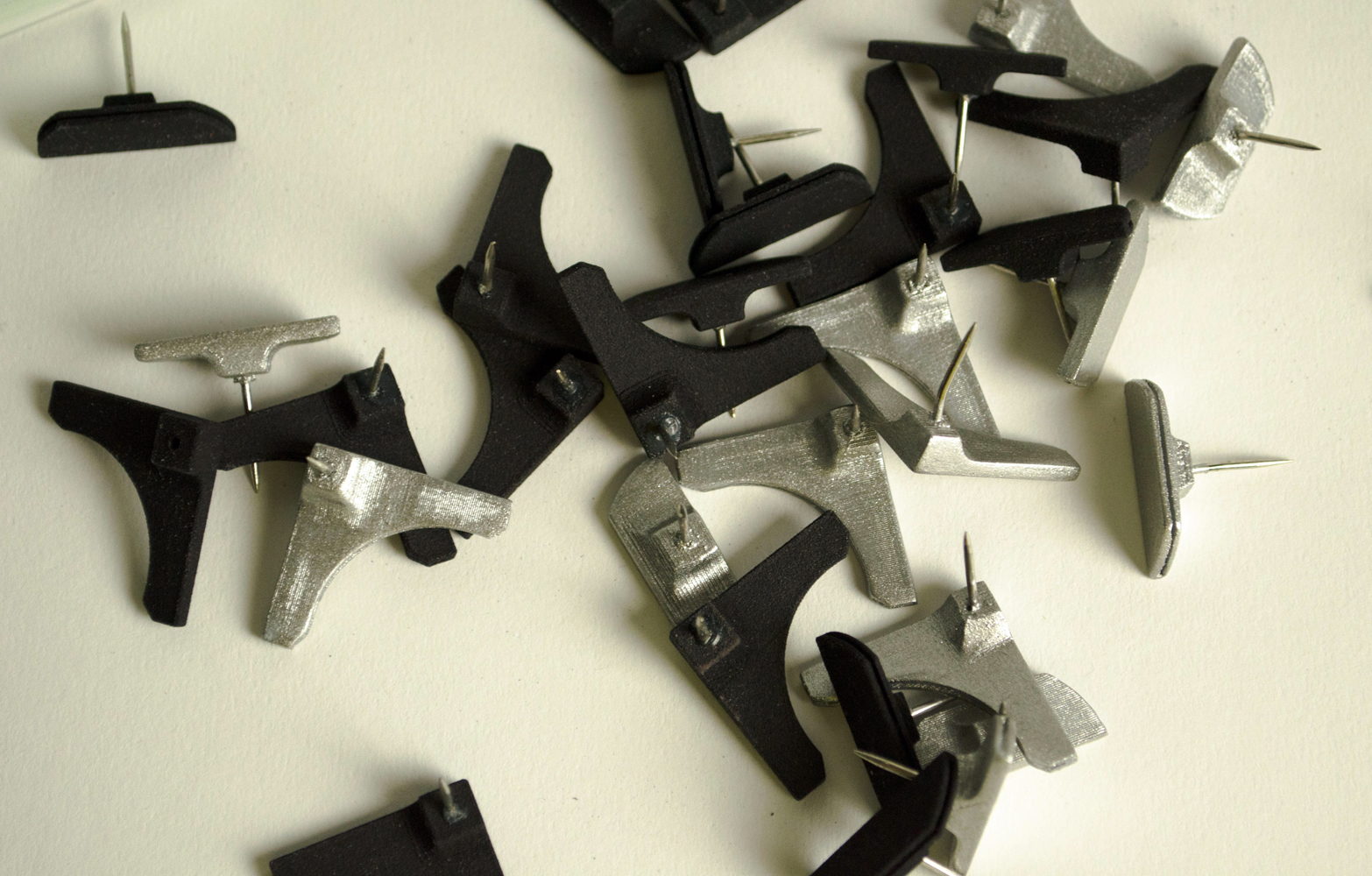 3D-printed in steel and black plastic. Framed elegantly holds pictures and momentos without punching holes in the paper. A slight offset from the background surface provides a drop shadow for added visual depth.