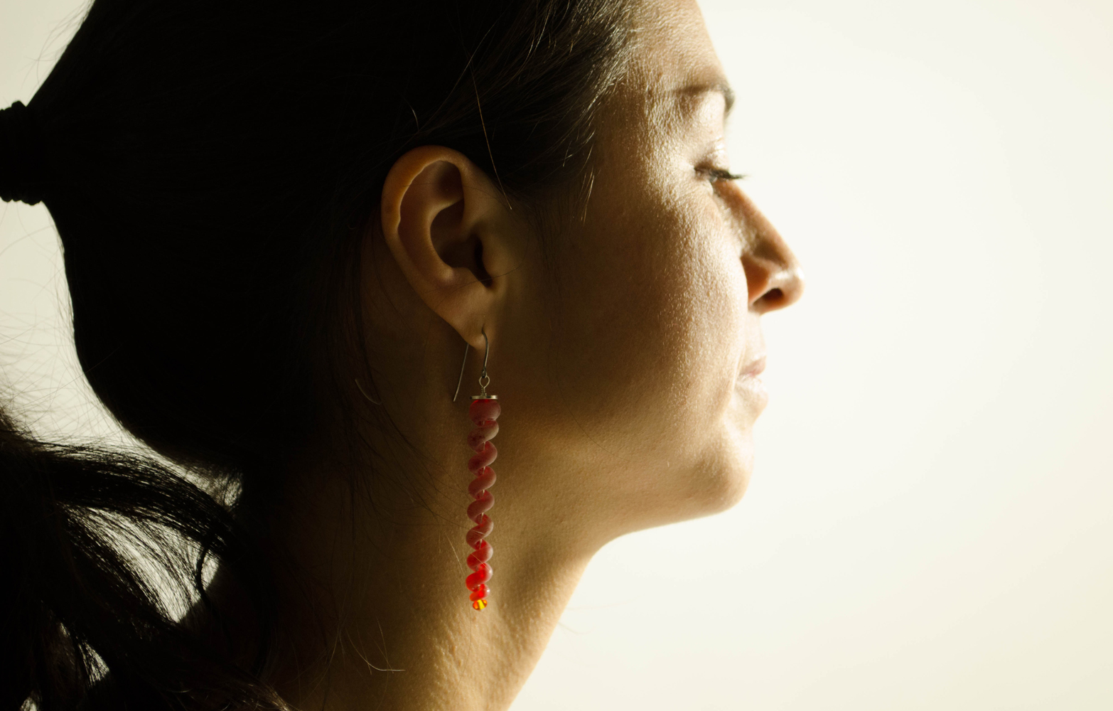 An old incandescent filament, knitted coin purses, and an old man's face with a variety of piercings started this piece. Again, I chose to create a jewelry piece and specifically earrings as it related to the man's piercings. A glow-in-the-dark glass powder pulled in the filament; I wanted the earrings to light up in the dark, but still appear delicate in the light. Knitting, in its most fundamental process, creates objects from a single strand of material - as a result, I kept the design as a single strand, even linking the center stabilizing wire from the top to the bottom of the piece.