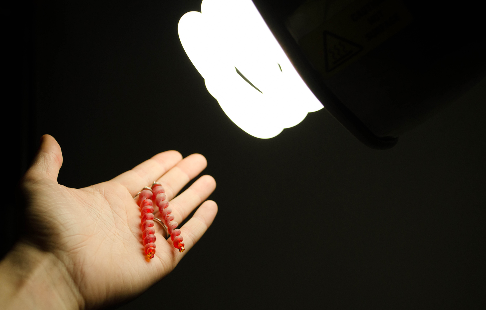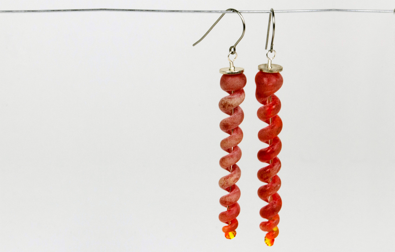 Glow-in-the-dark glass earrings reminiscent of light bulb filaments.